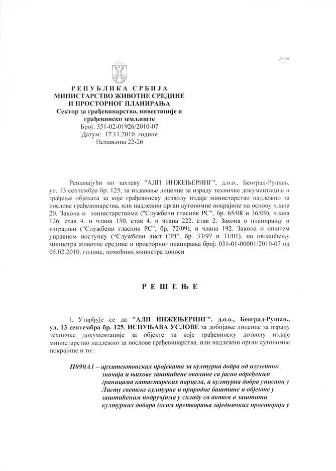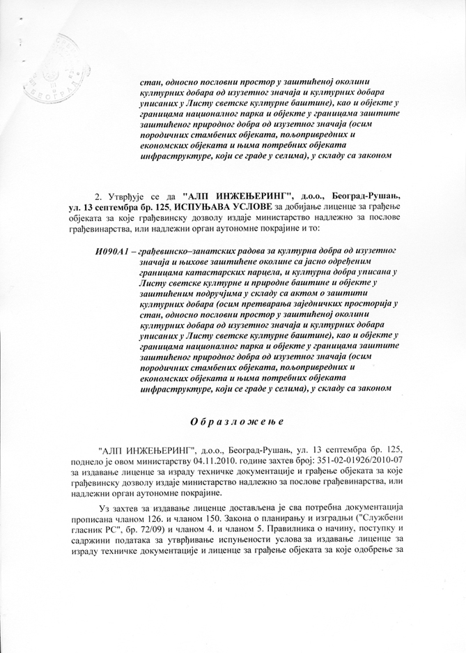Dugogodišnjim radnim i stručnom usavršavanjem kadrova stekli smo veliko iskustvo u radovima na kulturno-istorijskim spomenicima, što je krunisano dobijanjem „VELIKE LICENCE“, odnosno dozvole za izradu tehničke dokumentacije i izvođenje građevinsko- zanatskih radova na kulturnim dobrima od izuzetnog značaja i njihove zaštićene okoline i kulturnim dobrima upisanim u Listu svetske kulturne i prirodne baštine i objekte u zaštićenim područjima, kao i objektima u granicama nacionalnog parka i objekte u granicama zaštite zaštićenog prirodnog dobra od izuzetnog značaja.